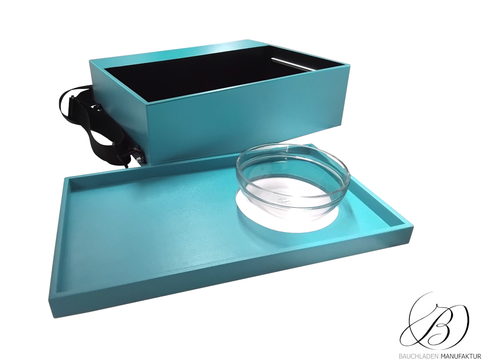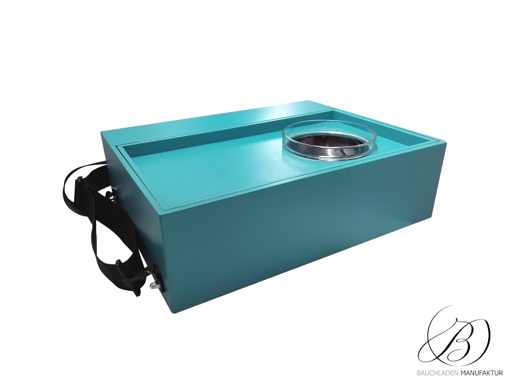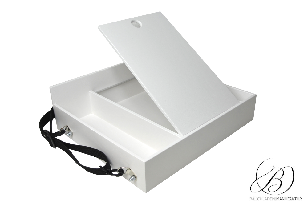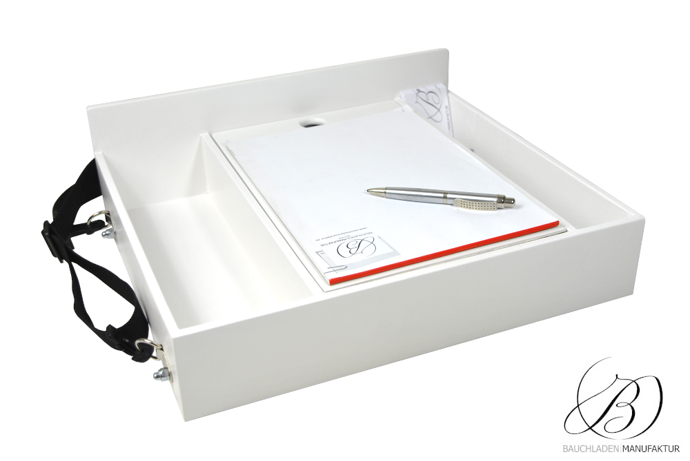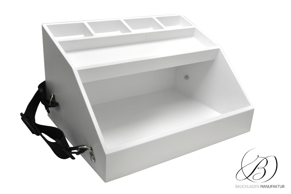 Bauchladen Roma Trennfach S mit einer verschiebbaren Ablage für z.B. Losverkauf. Die flexible Positionierung sorgt für optimale Handhabung.