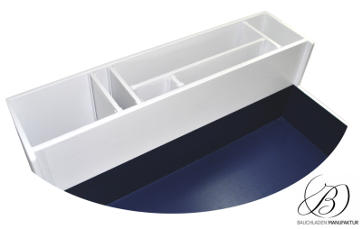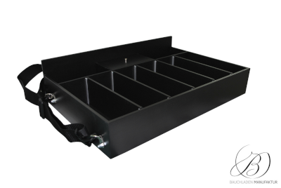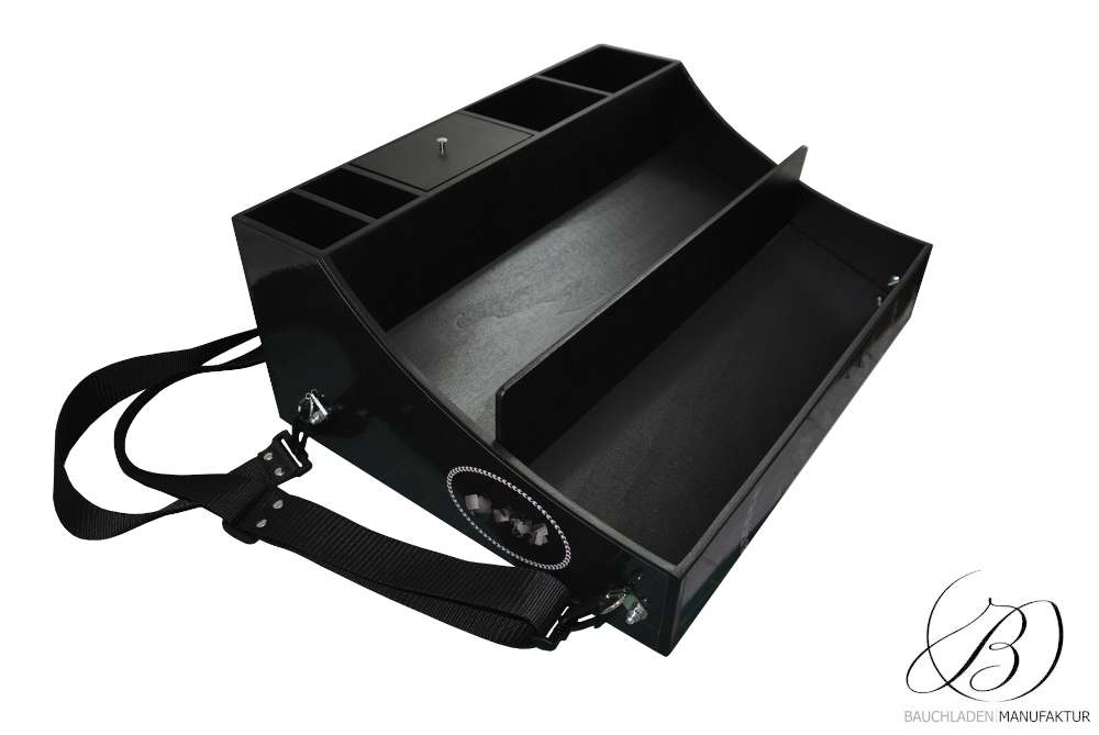 Bauchladen Roma Kassenfach mit maßgefertigter Fächeraufteilung: drei hintere Fächer (mittleres Fach abgedeckt) und herausnehmbare Trennwände vorne für maximale Flexibilität.