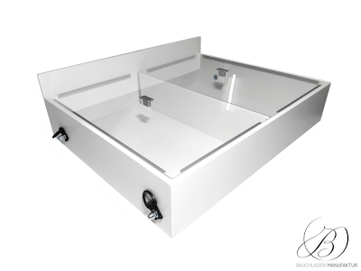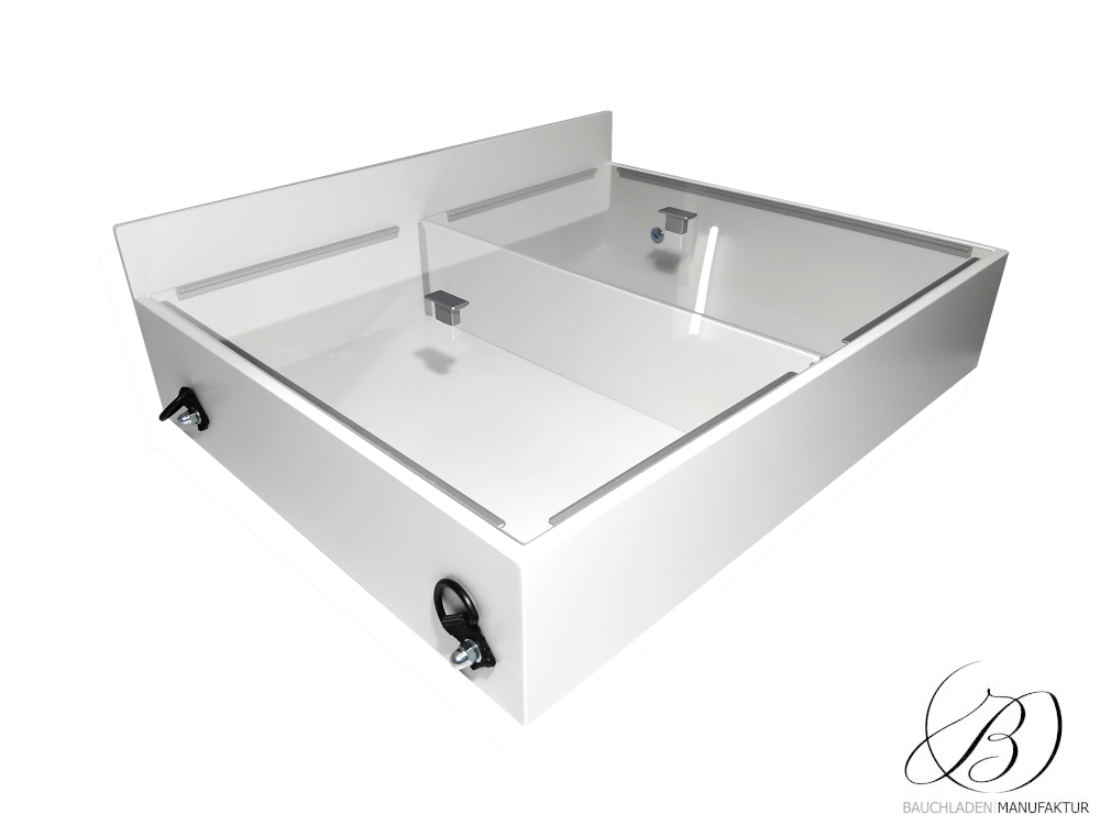 Bauchladen Roma M mit geteilter Plexiglas-Abdeckung auf Aluminiumleisten und praktischen Griffen. Schützt Inhalte und ermöglicht schnellen Zugriff.
