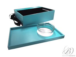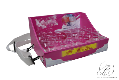 Bauchladen Palermo L mit herausnehmbarer Plexiglasplatte auf Aluminiumleisten – speziell für 2cl-Pinnchen konzipiert.